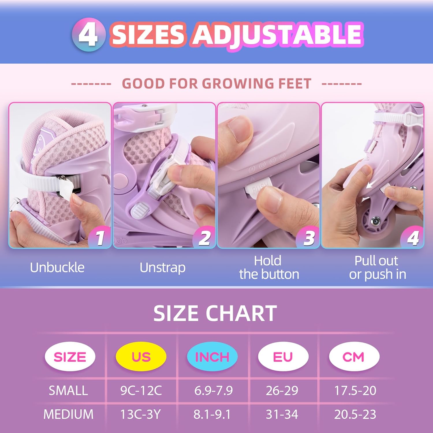 - Regulowany rozmiar dla dorastających dzieci: wystarczy jedno naciśnięcie przycisku, nasze wrotki dostosowują się do czterech rozmiarów, dzięki czemu są idealne dla szybko rosnących dzieci i zapewniają, że jedna para wrotek rośnie wraz z dzieckiem, zapewniając wieloletnie użytkowanie i przyjemność.