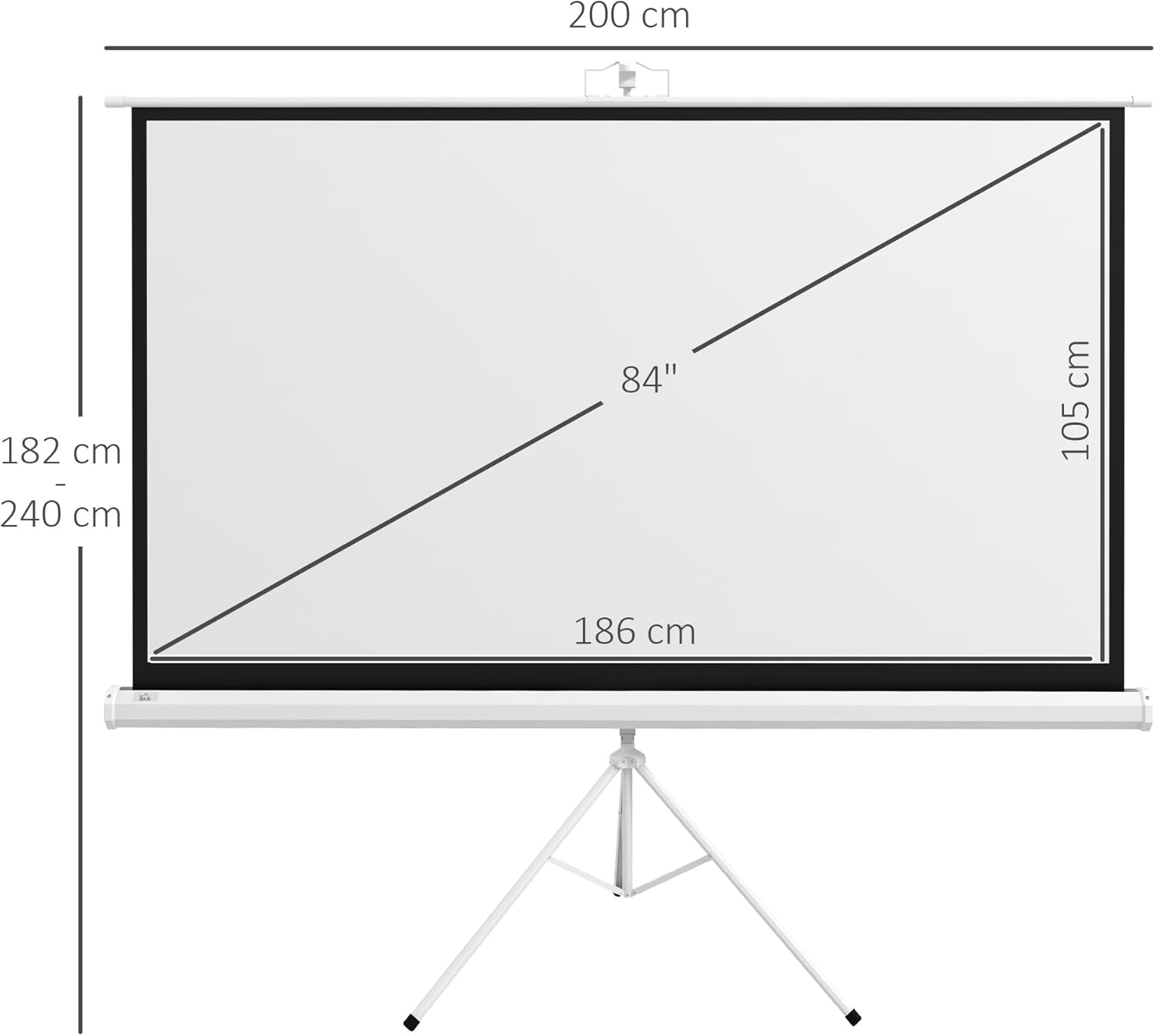 Ekran projekcyjny HOMCOM, 84 cale, proporcje 16:9, z regulowanym wspornikiem statywu, plastikowy i metalowy ekran projekcyjny, 200x8x118 cm, biały