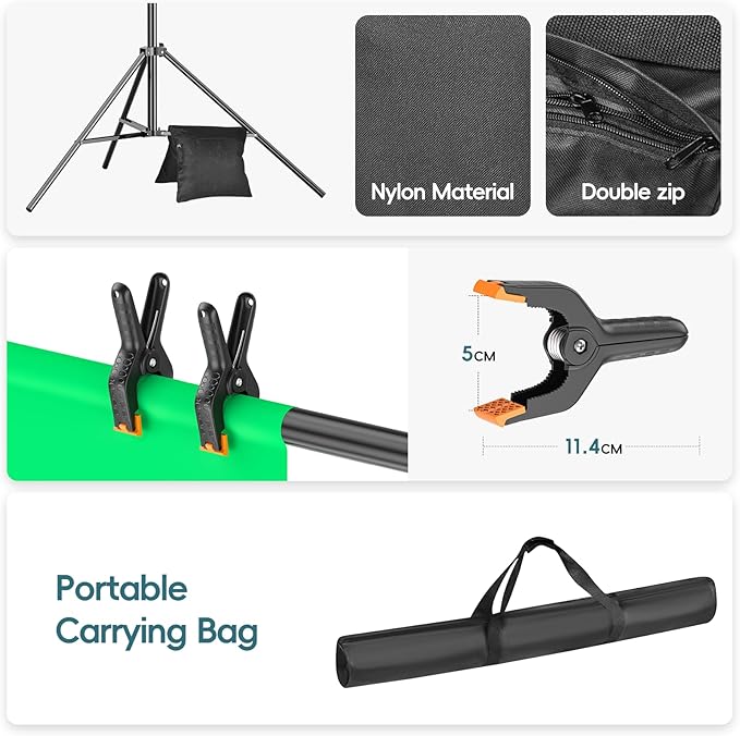 - Łatwy do przenoszenia: stojak na tło fotograficzne jest łatwy w montażu i demontażu. W zestawie przenośna torba transportowa ułatwiająca przechowywanie i transport. UWAGA: W zestawie 2 i 1 klucz imbusowy, należy zwrócić uwagę w przypadku zgubienia
