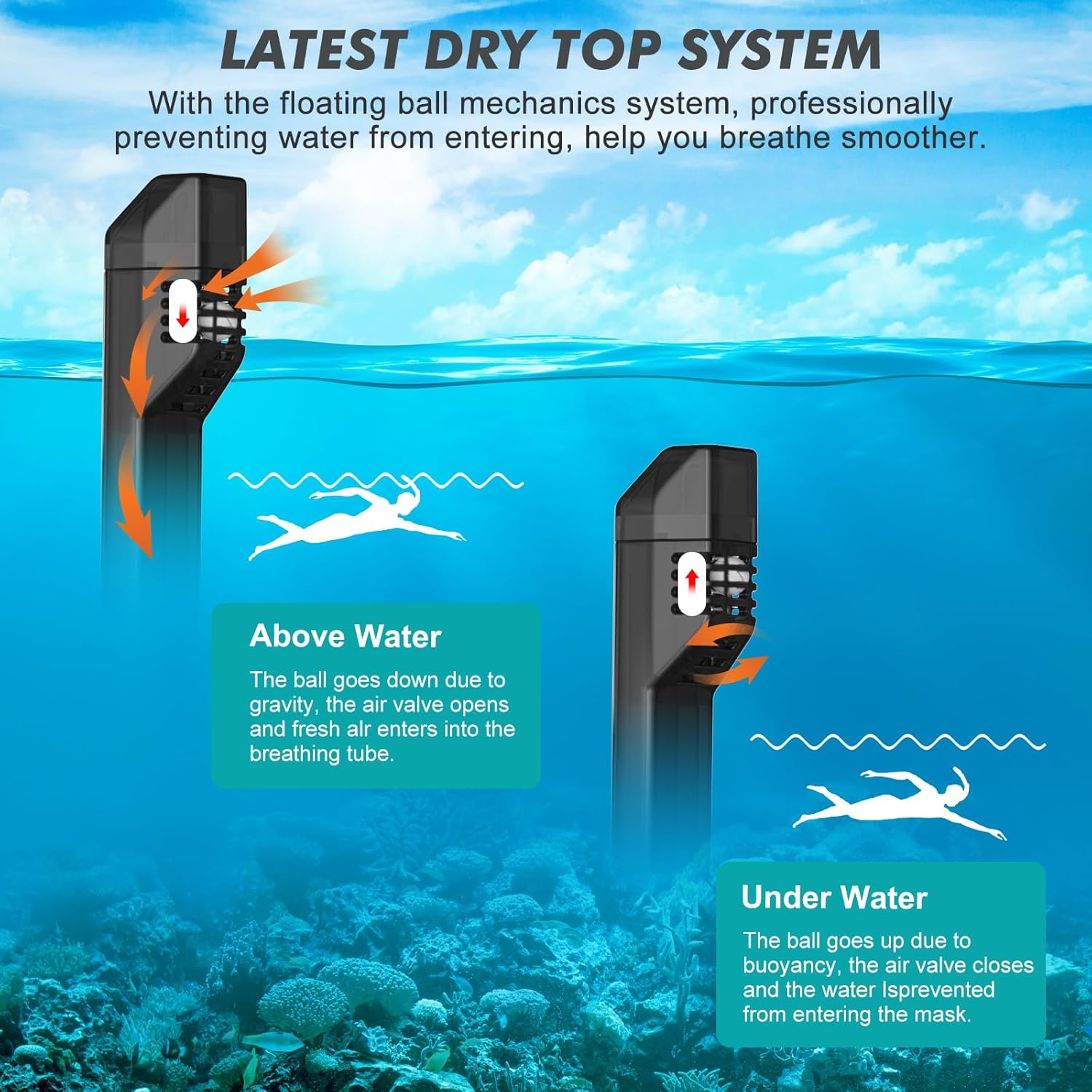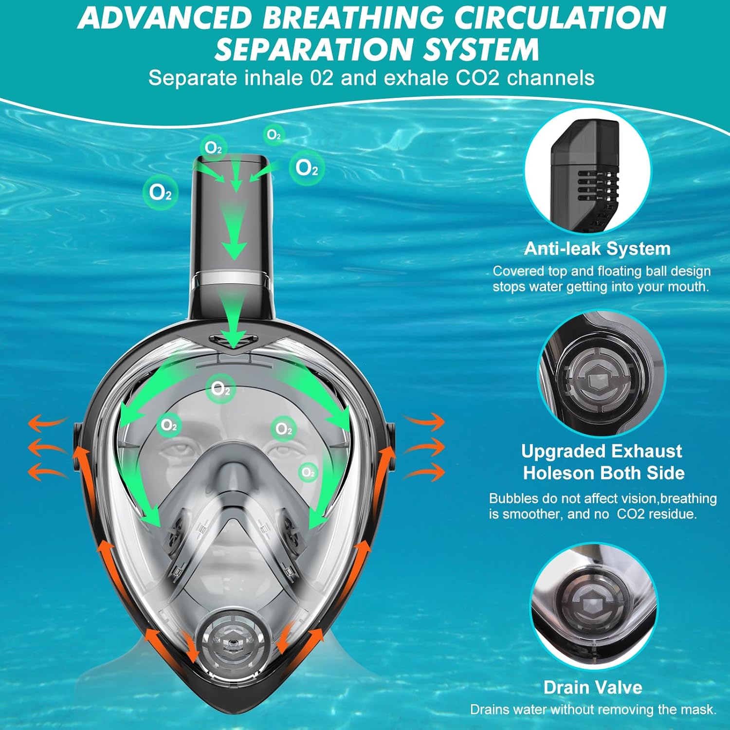 - 2024 ULEPSZONY SYSTEM KRĄŻENIA ODDECHOWEGO: Pełnotwarzowa maska do nurkowania KUYOU dla dorosłych jest wyposażona w ulepszony system krążenia oddechowego, wyposażony w większą rurkę oddechową zwiększającą dopływ powietrza, zapewniając płynne i naturalne oddychanie podczas nurkowania z rurką. Ekskluzywne kanały wydechowe po obu stronach znacznie przyspieszają wydech, skutecznie redukując 30% pozostałości gazu. Dwustopniowy zawór przeciwprzepływowy może zmniejszyć przepływ wsteczny powietrza i zapewnić bezpieczne oddychanie.