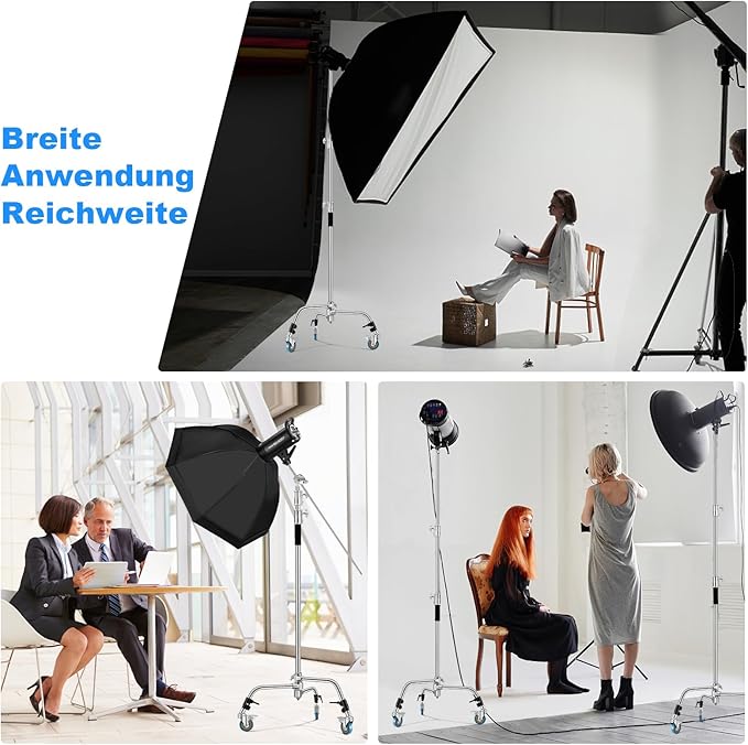 - Regulacja - stojak w kształcie litery C z kółkiem środkowego stojaka 3-nożnego stojaka można ustawić w zakresie od 150 cm do 330 cm, dzięki czemu masz więcej różnych możliwości nagrywania. 3 nogi na spodzie można rozłożyć o 120 stopni, aby Twoje wyposażenie było stabilniejsze. Praktyczny do zdjęć.