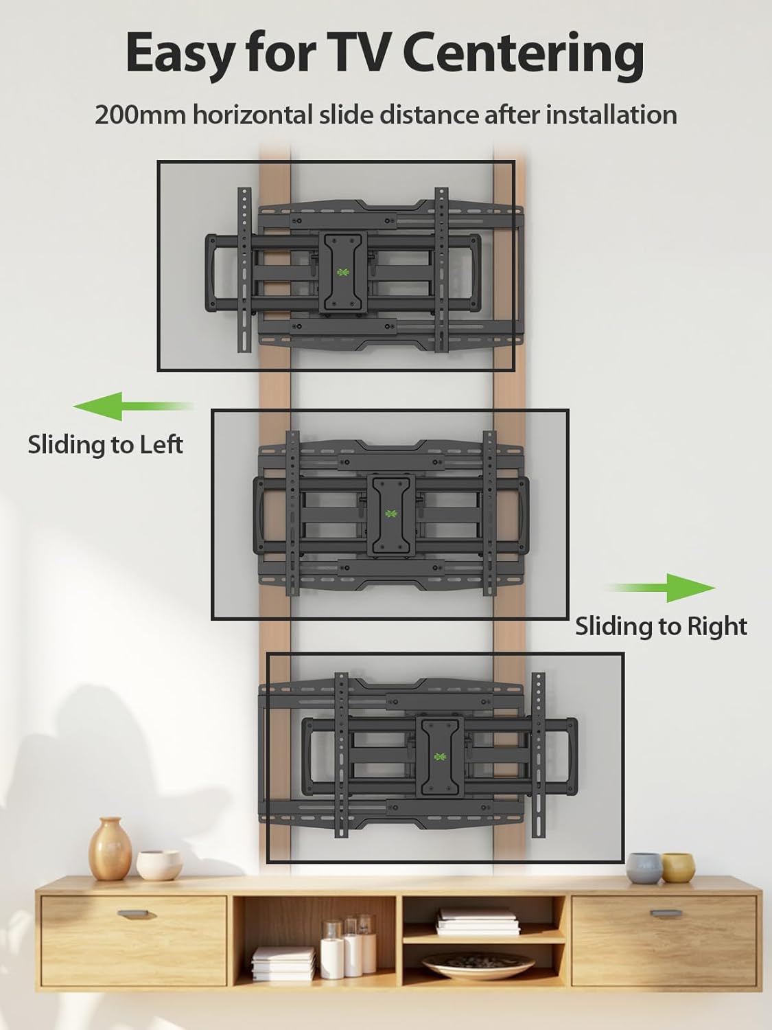 - Doskonała kontrola centrująca: uchwyt ścienny do telewizora o sprytnej konstrukcji umożliwia poziome przesuwanie telewizora w lewo lub w prawo do maksymalnie 8 cali do środka na 24-calowej płycie ściennej. Inne śruby zabezpieczają uchwyty przed wysunięciem się.